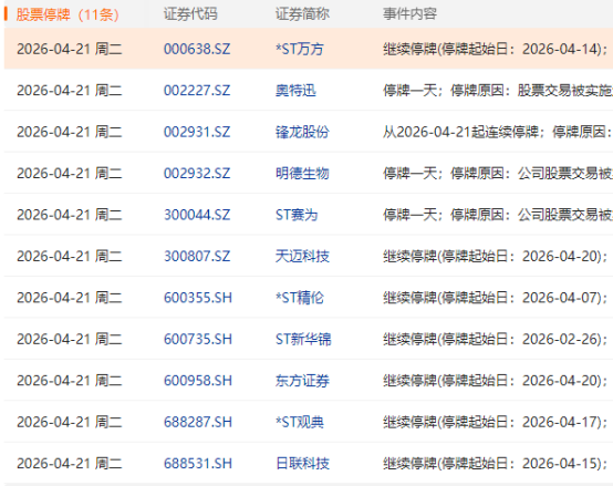 上证报中国证券网讯 4月21日,4家公司临停:奥特迅(002227)、锋龙股份(002931)、明德生物(002932)、ST赛为(300044),7家公司复牌:*ST中岩、安诺其(300067)、ST亚光、海泰科(301022)、花王股份、ST臻镭、天微电子(688511)。