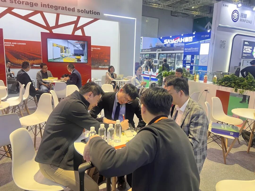 本次展会,新美星(300509)重点展示吹贴灌旋技术、无菌灌装工艺、产存一体化智能工厂解决方案,紧密贴合新型包装材料适配需求,优化整线柔性生产配套能力。依托成熟无菌生产体系,全方位保障饮品全流程安全生产品质;吹贴灌旋集成工艺有效精简生产工序、提升整体运行效率;产存一体化模式打通生产、仓储、调度全链路智能化管理,助力客户实现降本增效、精益运营。8.1C46展位,现场工作人员认真对接每一位来访嘉宾,细致讲解工艺优势、配套适配方案与全周期(883436)售后保障,深入沟通项目规划与长期合作思路,收获大量行业关注与良好口碑。