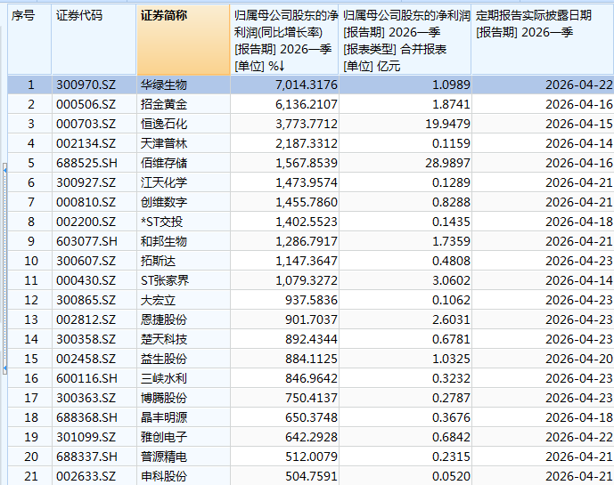 上述11家2026年一季度净利润增速超过10倍的公司分别是:华绿生物(300970)、招金黄金(000506)、恒逸石化(000703)、天津普林(002134)、佰维存储(688525)、江天化学(300927)、创维数字(000810)、*ST交投(002200)、和邦生物(603077)、拓斯达(300607)、ST张家界(000430)。