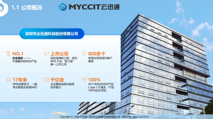 深圳市云迅通科技股份有限公司(以下简称“云迅通”)成立于2009年,注册资本2300万元,2015年成功挂牌新三板,成为MES领域首家登陆新三板的企业。公司总部位于深圳市龙岗区天安数码城,是国家高新技术企业、深圳市“专精特新(885929)”企业,持有双软认证、ISO9001质量管理体系认证及CMMI3级资质认证,并入选深圳市制造业数字化转型咨询诊断服务商。公司坚持自主研发,现有研发团队近60人,累计研发投入超6000万元,拥有近60项软件著作权及2项软件产品登记证书。