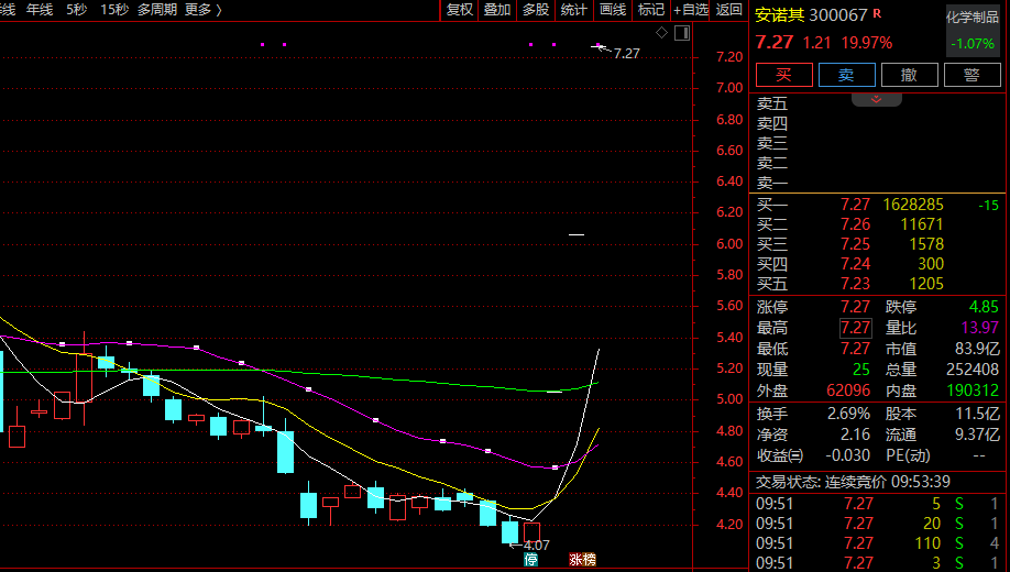 算力租赁(886050)概念拉升,安诺其(300067)20cm涨停,走出3连板,超160万手买单封死。旗天科技(300061)20cm涨停,浙文互联(600986)、佳华科技(688051)、利通电子(603629)等跟涨。
