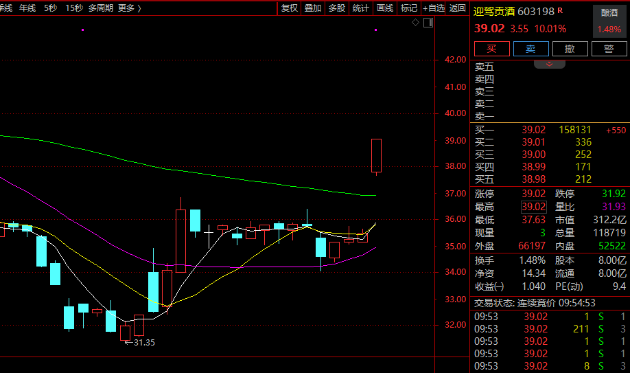 白酒(881273)板块走高,迎驾贡酒(603198)涨停,老白干酒(600559)、山西汾酒(600809)、古井贡酒(000596)、今世缘(603369)等跟涨。