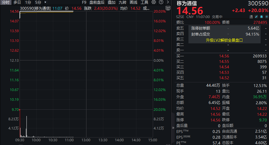 移为通信(300590)(300590)今日开盘后快速拿下年内首个“20CM”涨停。