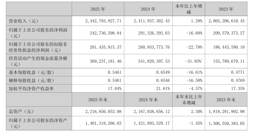 4月22日晚间,劲仔食品(003000)发布2025年年报,报告期内实现营业收入24.43亿元,同比增长1.28%;归属于上市公司股东的净利润2.43亿元,同比下降16.68%;扣非净利润2.01亿元,同比下降22.78%。