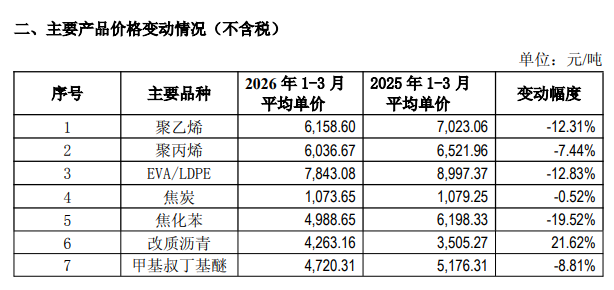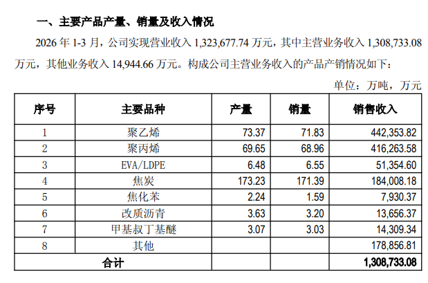 经营数据层面,2026年1-3月,公司主营业务收入130.87亿元,核心产品产销稳定。聚乙烯产量73.37万吨、销量71.83万吨,实现销售收入44.24亿元;聚丙烯产量69.65万吨、销量68.96万吨,实现销售收入41.63亿元;EVA/LDPE产量6.48万吨、销量6.55万吨,实现销售收入5.14亿元;焦炭产量173.23万吨、销量171.39万吨,实现销售收入18.40亿元,其余产品亦实现稳定销售。