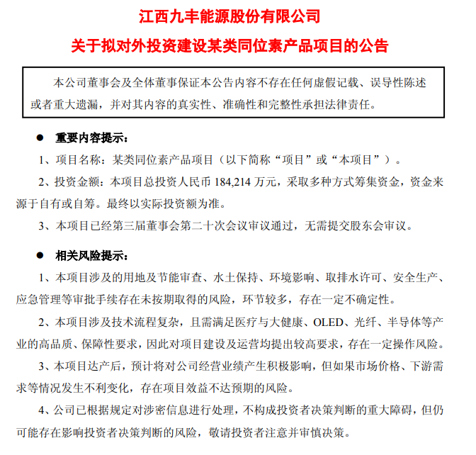 九丰能源(605090)公告,公司控股子公司江西九丰稳同新材料有限公司(“九丰稳同”)拟对外投资建设某类同位素产品项目,项目总投资人民币18.42亿元。