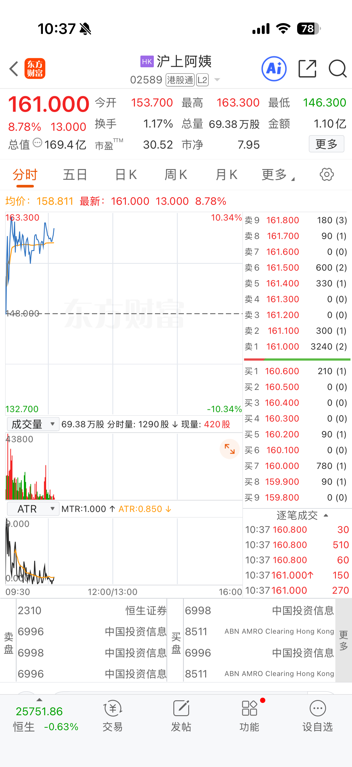 上证报中国证券网讯(记者何治民)4月24日,沪上阿姨(HK2589)高开高走,一度涨超10%,截至10时37分,股价涨8.78%,报161港元/股。至此,过去10个交易日,公司股价累计涨幅达115.38%。
