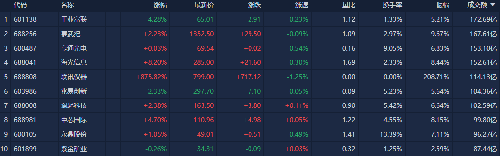 个股方面,工业富联(601138)全天成交额超172亿元位居沪深两市第一,寒武纪(688256)、亨通光电(600487)、海光信息(688041)等个股成交额居前。
