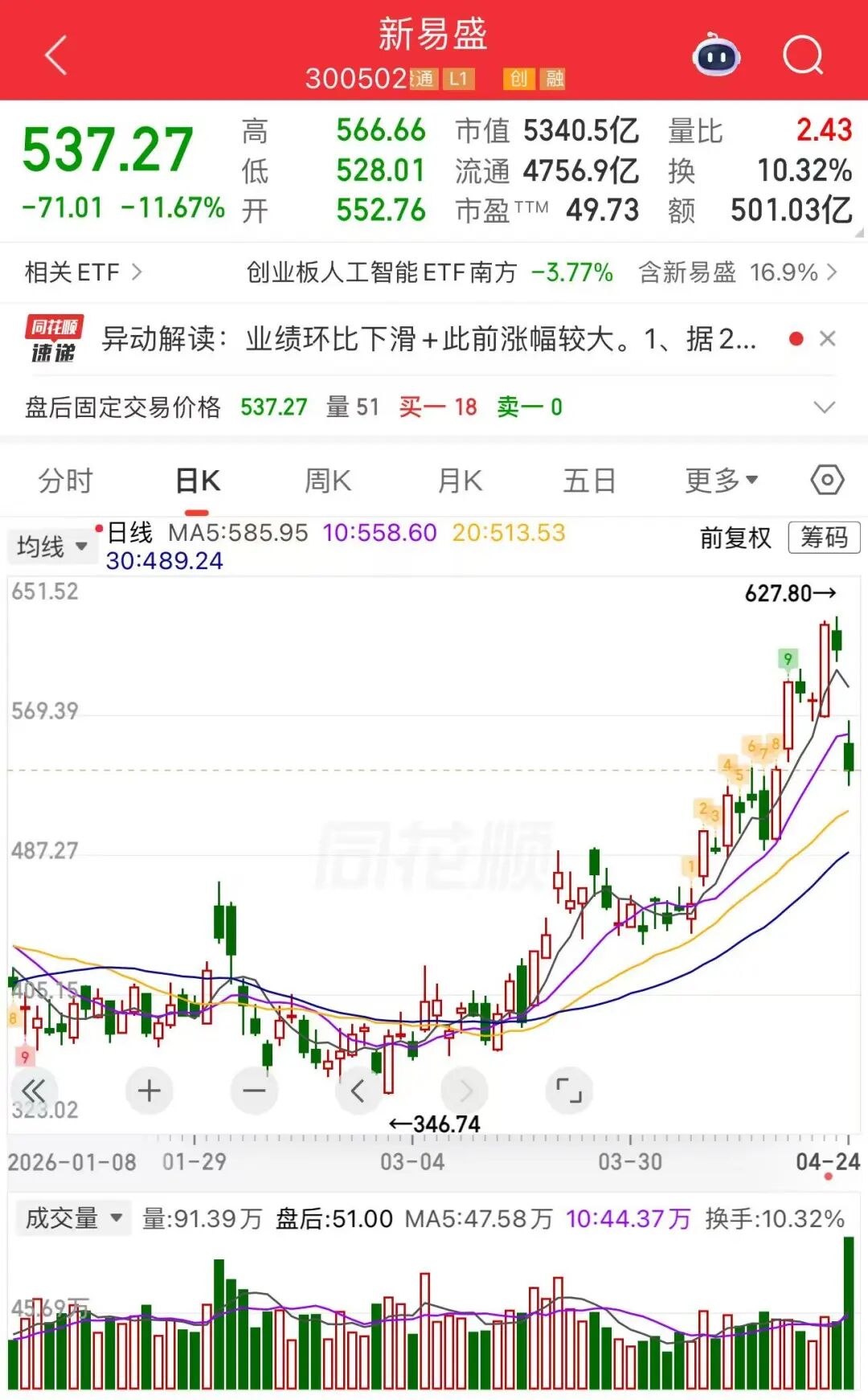 4月23日晚间,新易盛(300502)发布2026年一季报,公司实现营业收入83.38亿元,同比增长105.76%;归母净利润27.80亿元,同比增长76.80%。市场有观点认为,之前市场对其2026年净利润的一致预期约为97亿元—99亿元,按一季度通常占全年30%—35%推算,隐含一季度净利润为29亿元—34亿元,中位偏乐观预期在32亿元—33亿元附近,实际落地的27.80亿元低于市场预期。
