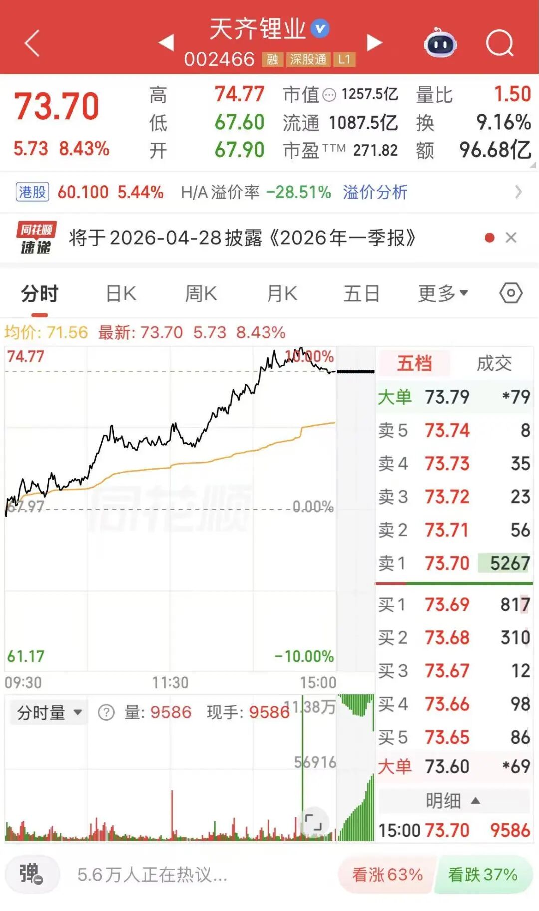 天齐锂业(002466)午后一度触及涨停,最新市值为1257.5亿元。