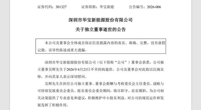 4月24日,深圳市华宝新能(301327)源股份有限公司发布《关于独立董事逝世的公告》,披露公司独立董事吴辉于4月23日不幸因病逝世,年仅41岁。