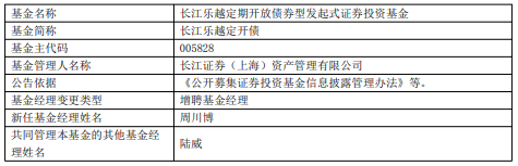 中国经济网北京4月27日讯近日,长江证券(000783)(上海)资管公告,长江乐越定开债(005828)增聘周川博。