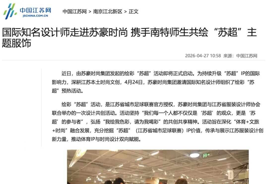 为深化“体育(884258)+文旅+时尚”融合发展,充分挖掘“苏超”(江苏省城市足球联赛)IP价值,经江苏省城市足球联赛官方授权,江苏苏豪时尚(600287)集团股份有限公司、江苏省服装设计师协会联合举办绘彩“苏超”——2026年“苏超”时尚服饰联名设计挑战赛。