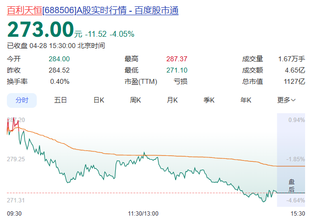截至4月28日收盘,百利天恒(688506)跌4.05%,报273元/股,总市值为1127亿元。