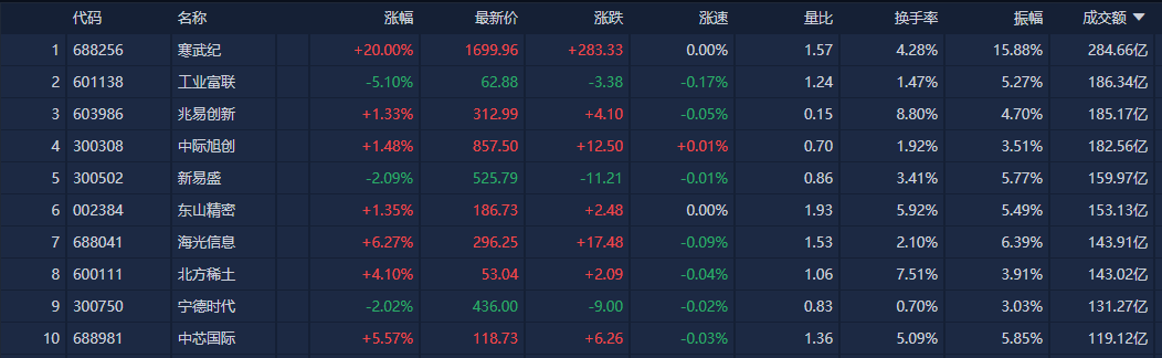 个股方面,寒武纪(688256)成交额超284亿元居沪深两市第一,工业富联(601138)、兆易创新(603986)、中际旭创(300308)成交额均超180亿元紧随其后。