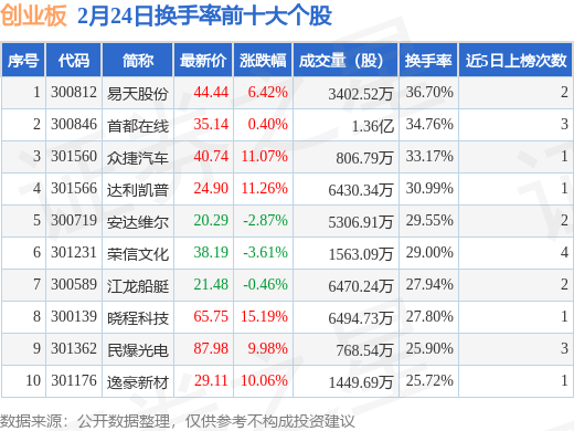 当日创业板换手率前10大个股中7只个股收涨,平均涨幅9.2%,其中易天股份(300812)以换手率36.7%排第一,6只个股近5个交易日中多次上榜。