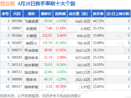 当日创业板换手率前10大个股中5只个股收涨,平均涨幅9.05%,其中飞南资源(301500)以换手率44.72%排第一,8只个股近5个交易日中多次上榜。