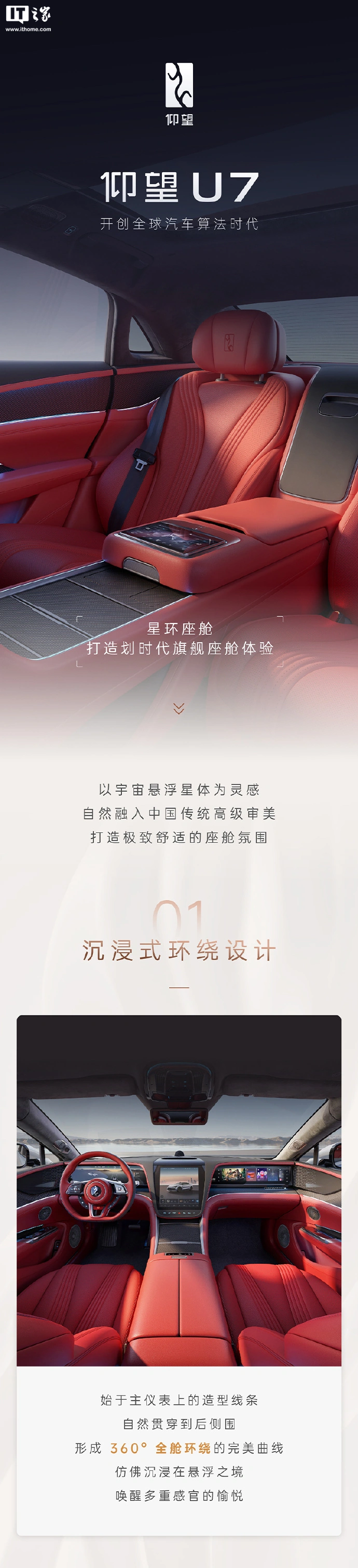 IT之家 11 月 13 日消息,今天上午,比亚迪(002594)旗下百万级豪华品牌仰望汽车公布了全新轿车 —— 仰望 U7 的内饰官图。新车沿用家族化的“星环座舱”,还喊出了“开创全球汽车算法时代”的 Slogan。