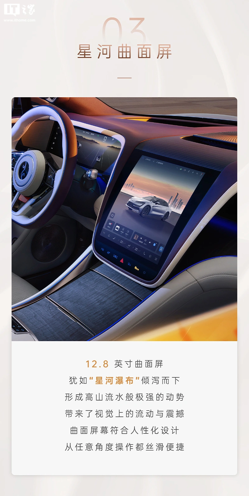 据介绍,新车内饰采用沉浸式环绕设计,造型线条形成 360 全舱环绕的曲线,中控台则采用了“中轴对称”的设计理念,将多块屏幕与内饰巧妙融合。其中央配备 12.8 英寸“星河曲面屏”,座椅表面采用 NAPPA 真皮包覆,车门上配备了材质为稀有枫木的门板和“宇航级”碳纤维饰板。