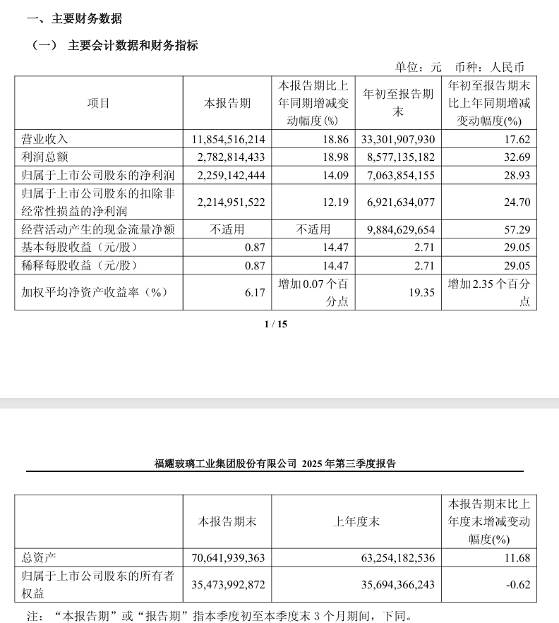 10月16日晚,福耀玻璃发布三季报,公司第三季度营业收入为118.55亿元,同比增长18.86%;前三季度营业收入为333.02亿元,同比增长17.62%;第三季度净利润为22.59亿元,同比增长14.09%,前三季度净利润为70.64亿元,同比增长28.93%。基本每股收益0.87元/股。