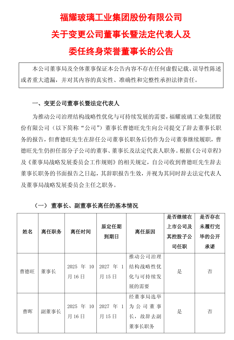 10月16日晚,福耀玻璃(600660)公告称,因推动公司治理结构战略性优化与可持续发展的需要,公司董事长曹德旺提交了辞去董事长职务的报告,在辞任公司董事长职务后,将继续担任公司董事及部分子公司的董事、董事长和法定代表人职务;同时,公司选举曹晖为新任董事长,并任命其为法定代表人及董事局战略发展委员会主任。委任曹德旺为终身荣誉董事长。
