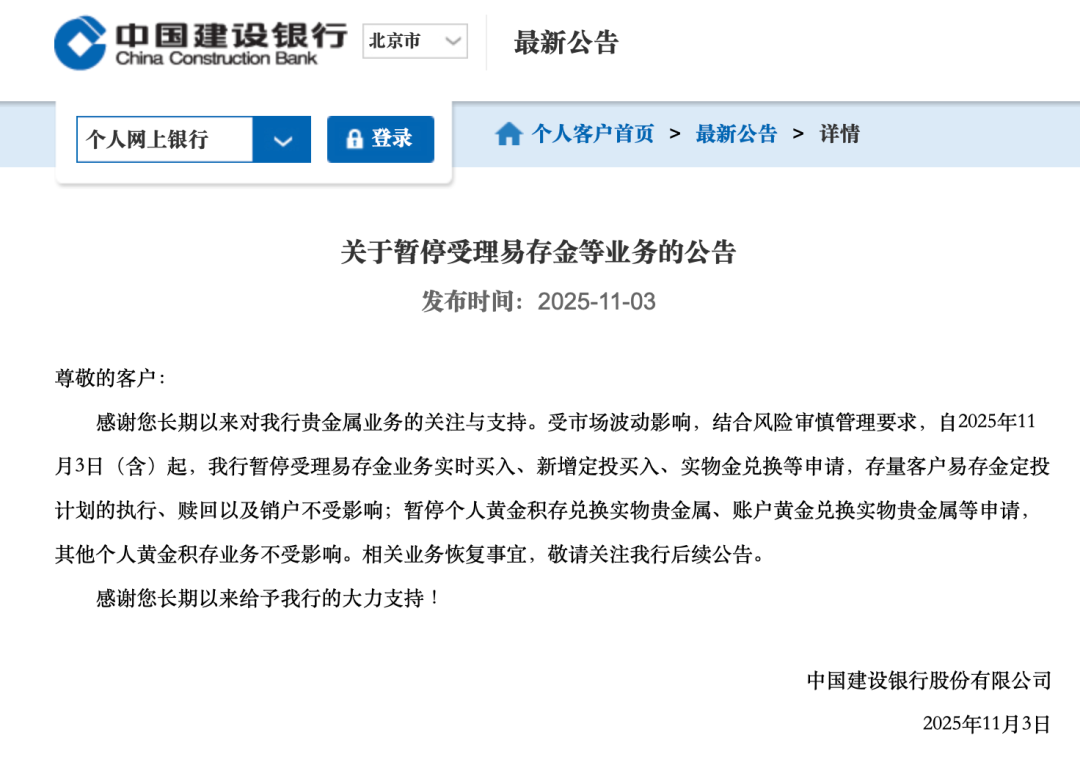 随后,建设银行(601939)也发布公告称,自11月3日(含)起,建行暂停受理易存金业务实时买入、新增定投买入、实物金兑换等申请,存量客户易存金定投计划的执行、赎回以及销户不受影响;暂停个人黄金积存兑换实物贵金属、账户黄金兑换实物贵金属等申请,其他个人黄金积存业务不受影响。