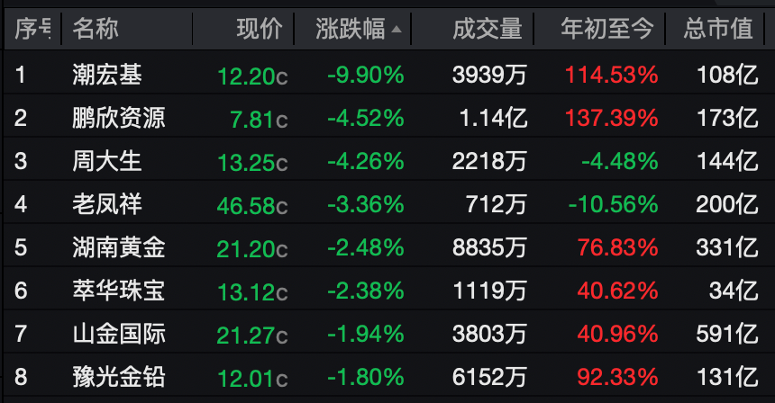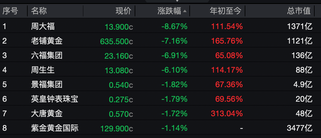 港股方面,老铺黄金、周大福、六福集团等黄金珠宝概念股股价大幅下挫。截至港股收盘,周大福报13.9港元/股,日跌8.67%,老铺黄金报635.5港元/股,日跌7.16%,六福集团、周生生等跟跌。