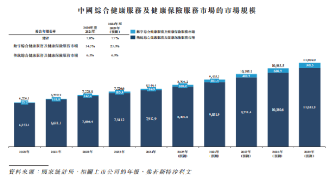 中国健康服务市场蕴藏巨大的增长潜力正成为轻松健康集团扩容的核心引擎。按收入计,中国综合健康服务及健康保险服务市场由2020年的人民币62,261亿元增至2024年的人民币81,494亿元,复合年增长率为7.0%,预期2029年将达至人民币118,040亿元,2024年至2029年的复合年增长率为7.7%。