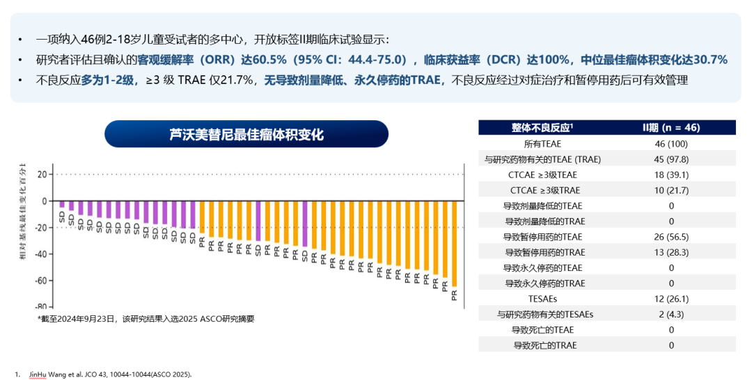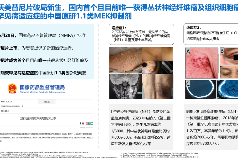 在11月28日下午的医疗分论坛中,首都医科大学附属北京天坛医院肿瘤综合科康庄教授作为研究者代表向与会者详细解读了中国原研1.1类新药芦沃美替尼片(商品名:复迈宁 )的临床研究数据。芦沃美替尼于2025年5月29日获得国家药品监督管理局(NMPA)批准上市,成为首个且目前唯一获得2岁及以上丛状神经纤维瘤(NF1-PN)儿童及青少年患者和朗格汉斯组织细胞增生症(LCH)及组织细胞肿瘤双罕见病适应症的中国原研1.1类MEK1/2抑制剂。