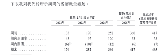 招股书显示,遇见小面采用直营或特许经营模式经营。其餐厅数量持续攀升,财务业绩亦取得快速增长。自2022年初至今,遇见小面的餐厅数量已由133家增长249.6%至465家。从其开店数据来看,其开店速度不断加快,2022年新开43家,2023年新开92家,2024年新开120家,而2025年至今已新开118家。
