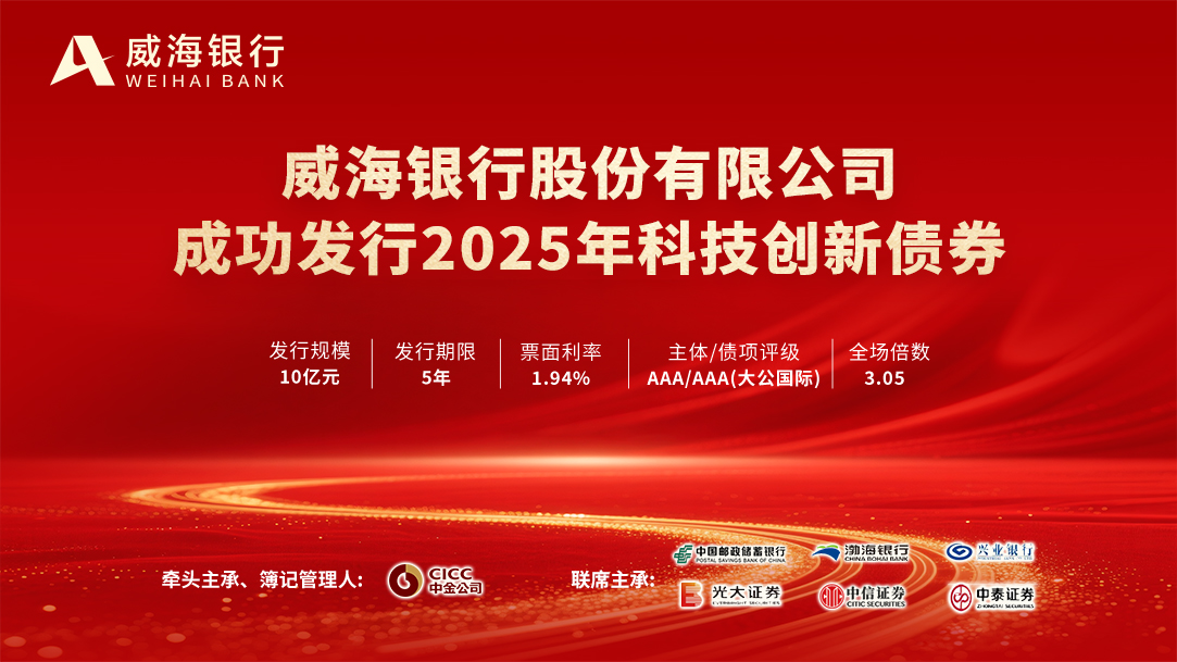 近日,威海银行成功发行首期科技创新债券,规模10亿元。本期债券发行期限5年,主体评级AAA,债项评级AAAsti,募集资金将专项用于支持科技创新领域业务,获得了市场的广泛关注与投资者的积极认购。此次发行得到了中国人民银行威海市分行的大力支持。