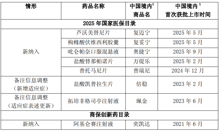 人民财讯12月7日电,复星医药(600196)12月7日公告,根据12月7日国家医保局、人社部发布的《国家基本医疗保险、生育保险和工伤保险药品目录(2025年)》(简称“2025年国家医保目录”)以及首次发布的《商业健康保险创新药品目录(2025年)》(简称“商保创新药目录”),公司及控股子公司/单位多款已上市产品获首次纳入或涉及备注信息调整。公司芦沃美替尼片等药品新纳入国家医保目录,阿基仑赛注射液新纳入商保创新药目录。