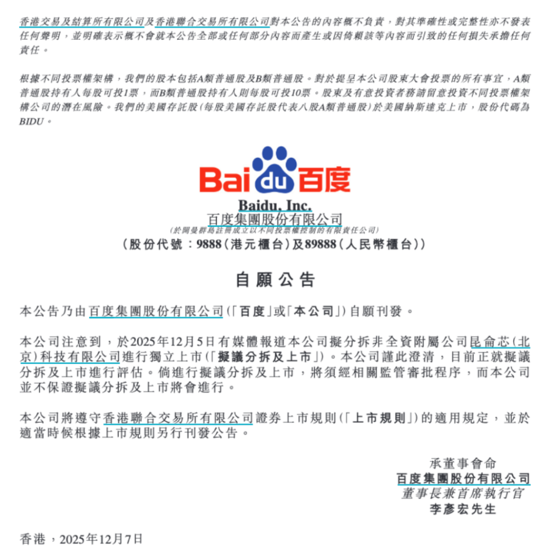12月7日,百度发布公告称,公司注意到,2025年12月5日有媒体报道公司拟分拆非全资附属公司昆仑芯(北京)科技有限公司(以下简称昆仑芯)进行独立上市。公司目前正就拟议分拆及上市进行评估。若进行分拆及上市,将须经相关监管审批程序,而公司并不保证分拆及上市将会进行。