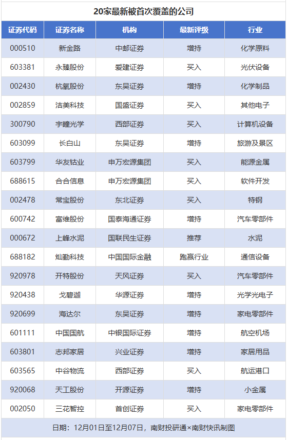 首次覆盖方面,12月1日至12月7日券商共给出了53次首次覆盖,其中新金路(000510)获得中邮证券给予“增持”评级,永臻股份(603381)获得爱建证券给予“买入”评级,杭氧股份(002430)获得东吴证券给予“增持”评级,洁美科技(002859)获得国盛证券(002670)给予“买入”评级,宇瞳光学(300790)获得西部证券给予“买入”评级。