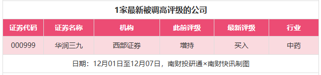 评级调高方面,12月1日至12月7日,西部证券(002673)对华润三九(000999)的评级从“增持”调高至“买入”。