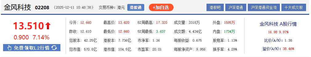 上证报中国证券网讯(记者 杨子晏)12月11日,金风科技(002202)H股开盘报12.66港元/股,盘中一度涨近8%,最高价报13.62港元/股。截至10时48分,金风科技H股报13.51港元/股,涨7.14%。同时,金风科技A股涨停。