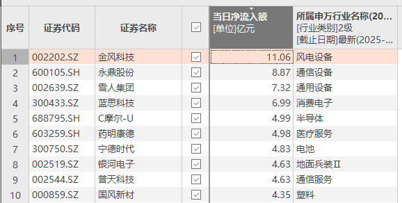 上证报中国证券网讯(记者 徐蔚)数据显示,12月11日,资金净流入额排名前十的个股依次是金风科技(002202)、永鼎股份(600105)、雪人集团(002639)、蓝思科技(300433)、C摩尔-U、药明康德(603259)、宁德时代(300750)、银河电子(002519)、普天科技(002544)、国风新材(000859)。其中,金风科技当日资金净流入额为11.06亿元。