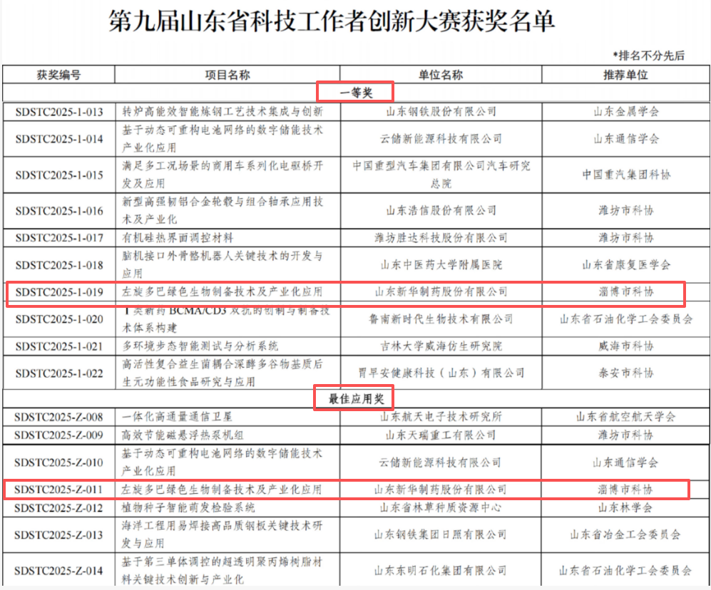 近日,山东省第九届科技工作者创新大赛评选结果公布,华鲁集团旗下新华制药(000756)申报的“左旋多巴绿色生物制备技术及产业化应用”项目,凭借其显著的技术创新性、产业应用价值及绿色环保理念,获得专家一致认可,荣获大赛一等奖和“最佳应用奖”。