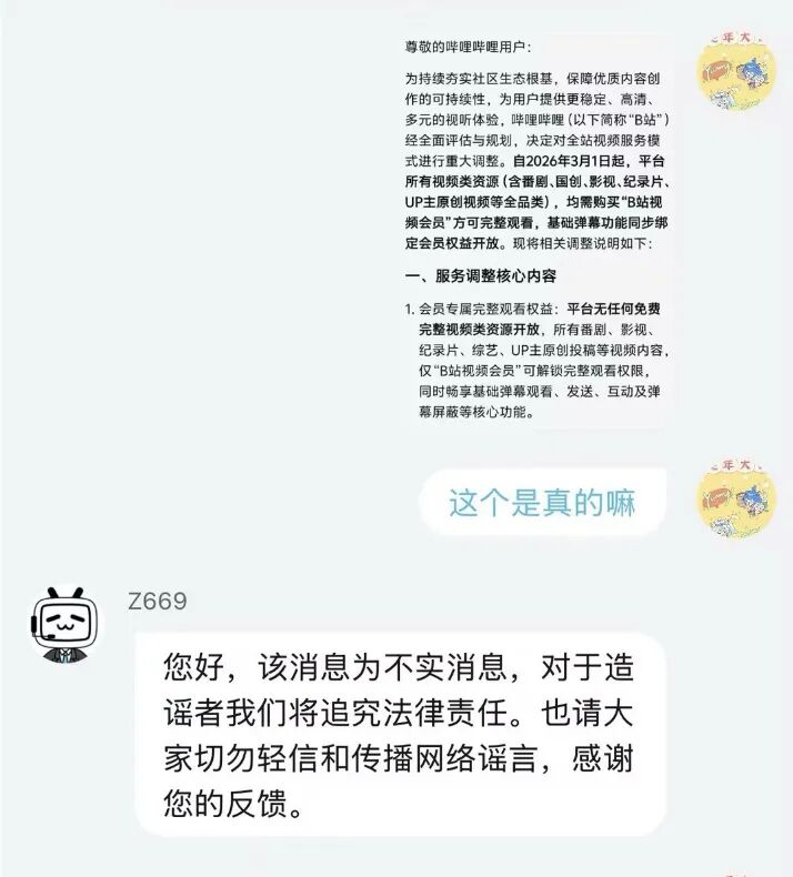 具体来看,一条关于B站致用户的截图在网络流传,其中称,“为持续夯实社区生态根基,保障优质内容创作的可持续性,为用户提供更稳定、高清、多元的视听体验,自2026年3月1日起,哔哩哔哩平台所有视频类资源均需购买B站视频会员方可完整观看,基础弹幕功能同步绑定会员权益开放。”