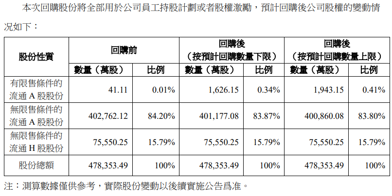 本次回购资金总额为不低于人民币10亿元且不超过人民币12亿元(均包含本数)。按照回购资金上限人民币12亿元、回购A股股份价格上限人民币63.09元/股测算,公司本次回购股份数量约为1,902.04万股,约占公司目前总股本的0.40%。具体回购股份的数量以回购期满时实际回购的股份数量为准。本次回购期限自董事会审议通过本次回购方案之日起12个月内。