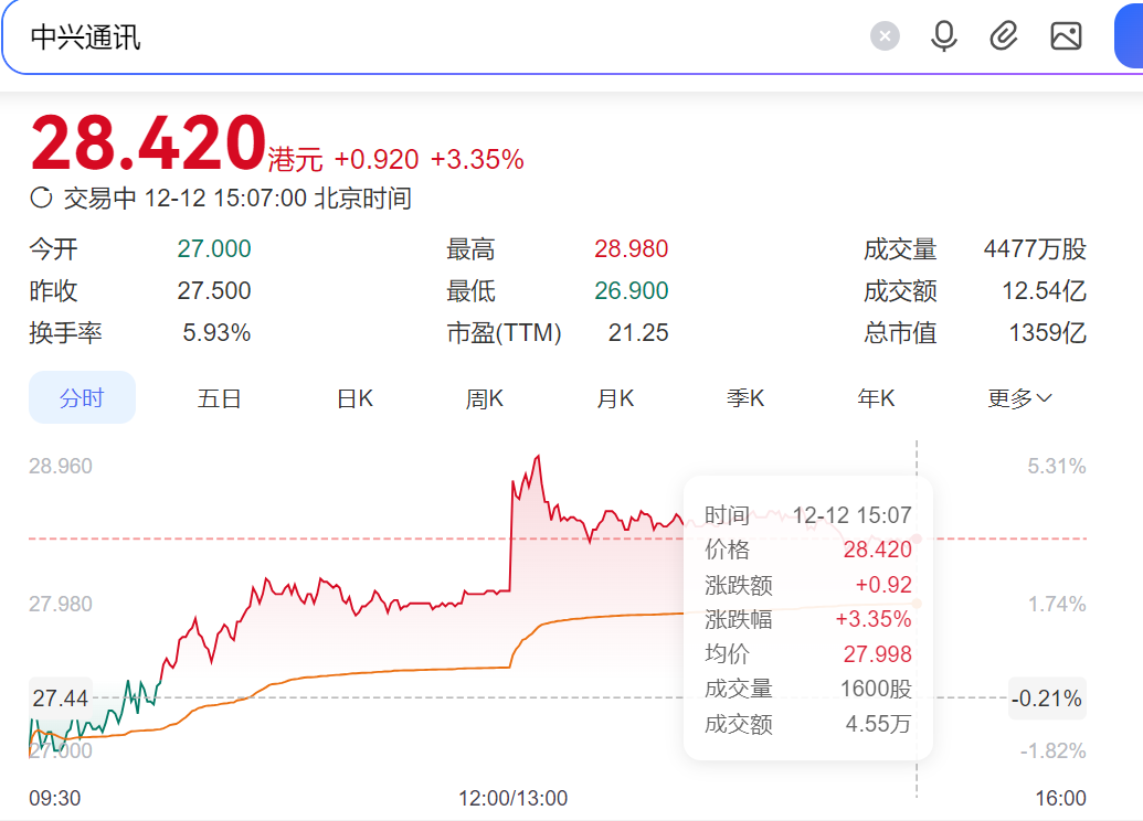 中兴通讯港股午后一度涨超5%,截至发稿涨3.35%,报28.98港元,成交额12.54亿港元。