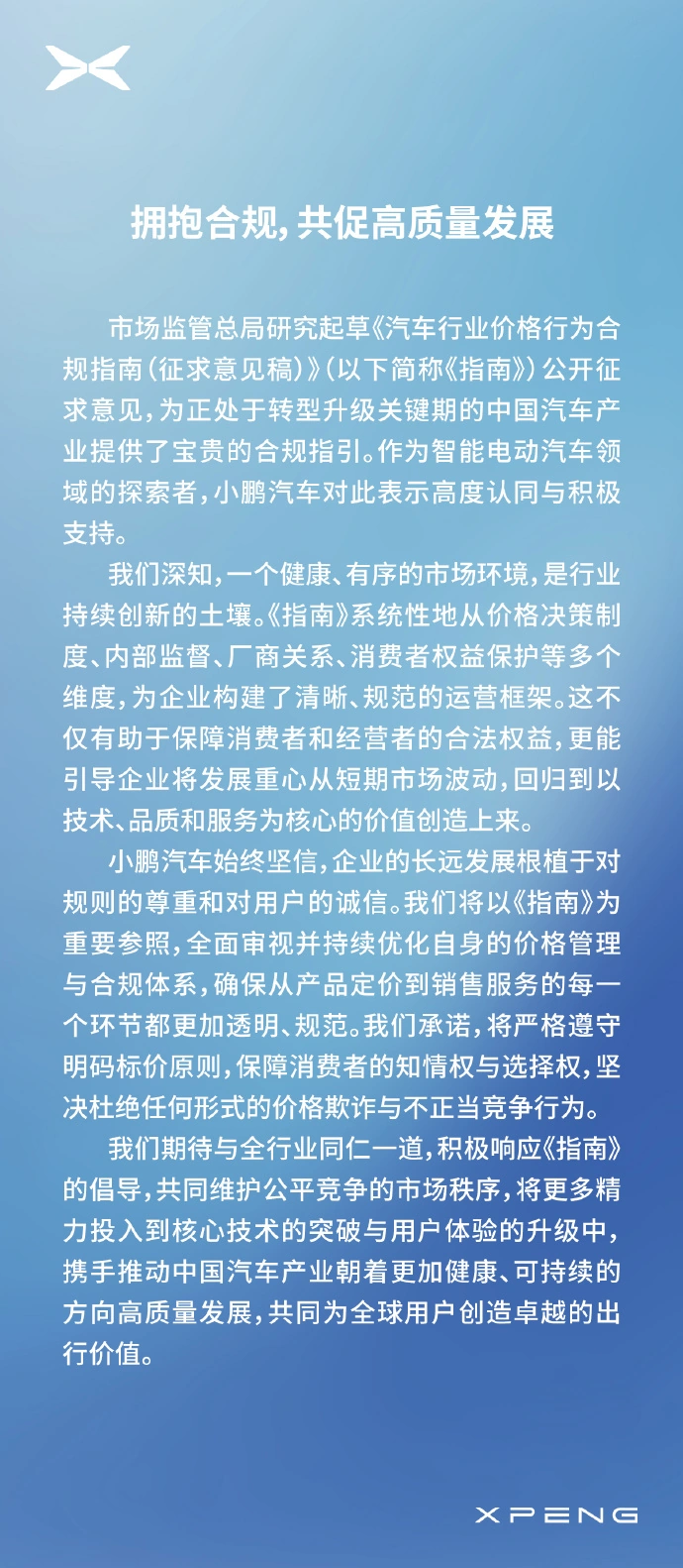 小鹏汽车始终坚信,企业的长远发展根植于对规则的尊重和对用户的诚信。我们将以《指南》为重要参照,全面审视并持续优化自身的价格管理与合规体系,确保从产品定价到销售服务的每一个环节都更加透明、规范。我们承诺,将严格遵守明码标价原则,保障消费者的知情权与选择权,坚决杜绝任何形式的价格欺诈与不正当竞争行为。