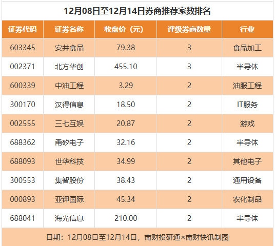 从券商推荐家数来看,12月8日至12月14日有153家上市公司得到券商推荐,其中安井食品(603345)、北方华创(002371)均获得3家券商推荐,海光信息、中油工程(600339)等均获得2家券商推荐。