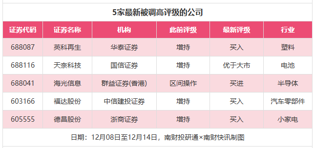 评级调高方面,12月8日至12月14日,券商调高上市公司评级达到5家次,最新数据包括了华泰证券对英科再生的评级从“增持”调高至“买入”,国信证券对天奈科技的评级从“增持”调高至“优于大市”,群益证券(香港)对海光信息的评级从“区间操作”调高至“买进”。