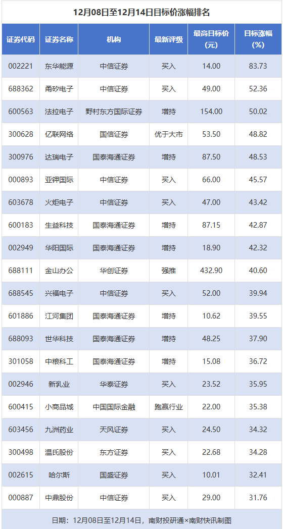 南财投研通数据显示,12月8日至12月14日,券商给予上市公司目标价共62次,按最新收盘价计算,目标价涨幅排名居前的公司有东华能源(002221)、甬矽电子、法拉电子(600563),目标价涨幅分别为83.73%、52.36%、50.02%,分别属于炼化及贸易、半导体、元件行业。