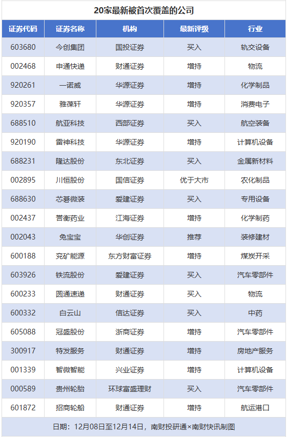 首次覆盖方面,12月8日至12月14日券商共给出了61次首次覆盖,其中今创集团(603680)获得国投证券给予“买入”评级,申通快递(002468)获得财通证券(601108)给予“增持”评级,一诺威、雅葆轩均获得华源证券给予“增持”评级。