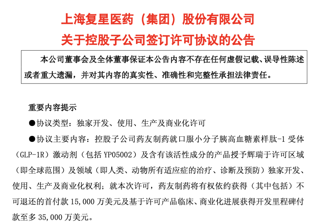 今年以来,复星医药在拓展创新药管线和国际化方面动作频频。12月9日晚间,复星医药宣布,控股子公司药友制药、复星医药产业与Pfizer Inc.(辉瑞)共同签订《许可协议》,由药友制药就口服小分子胰高血糖素样肽-1受体(GLP-1R)激动剂(包括YP05002)及含有该活性成分的产品授予辉瑞于全球范围独家开发、使用、生产及商业化的权利,许可领域包括人类、动物所有适应症的治疗、诊断及预防。