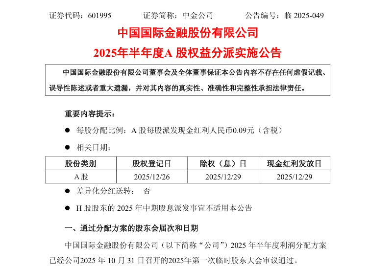 此外,中金公司(601995)(601995.SH)公告称,公司2025年半年度利润分配方案已经2025年第一次临时股东大会审议通过。以总股本48.27亿股为基数,每股派发现金红利人民币0.09元(含税),共计派发现金红利人民币4.34亿元(含税)。股权登记日为2025年12月26日,除权(息)日和现金红利发放日均为2025年12月29日。H股股东的2025年中期股息派发事宜不适用本公告。
