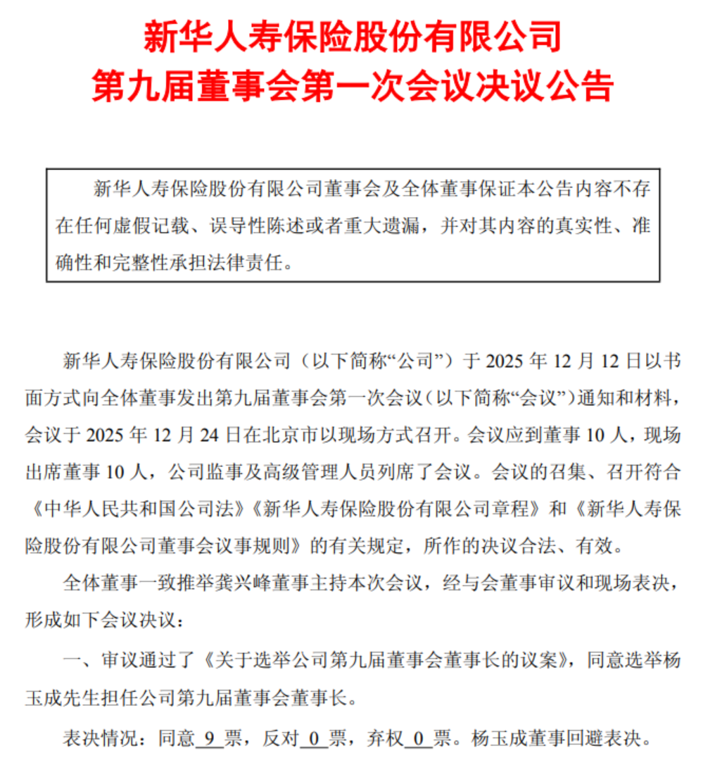 12月24日,新华人寿保险股份有限公司(以下简称“新华保险(601336)”)发布第九届董事会第一次会议决议公告。公告称,该公司于2025年12月12日以书面方式向全体董事发出第九届董事会第一次会议通知和材料,会议于2025年12月24日在北京市以现场方式召开,审议通过了《关于选举公司第九届董事会董事长的议案》,同意选举杨玉成担任公司第九届董事会董事长。