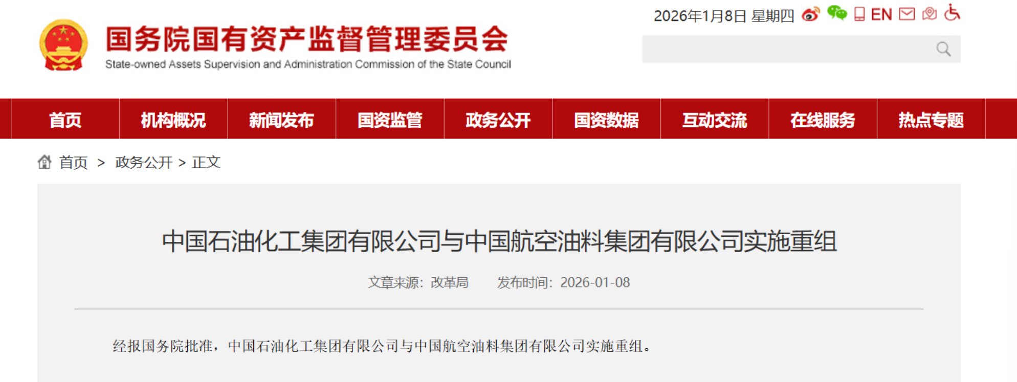 1月8日,国务院国资委发布消息称,经报国务院批准,中国石油化工集团有限公司(简称“中国石化(600028)”)与中国航空油料集团有限公司(简称“中国航油”)实施重组。